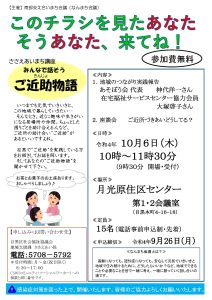 今年度のなんまち会議のイベントとして、『ささえあいまち講座 みんなで話そうご近助物語』を10月6日(木)10時~11時半、月光原住区セ